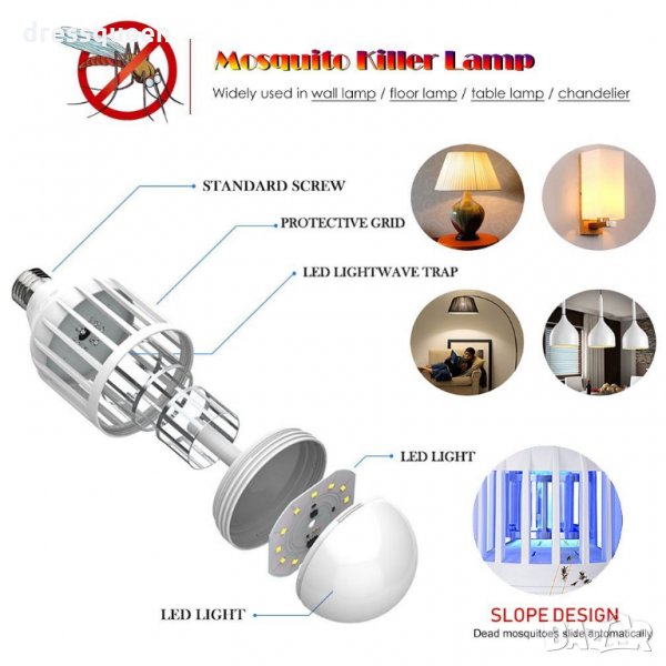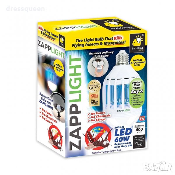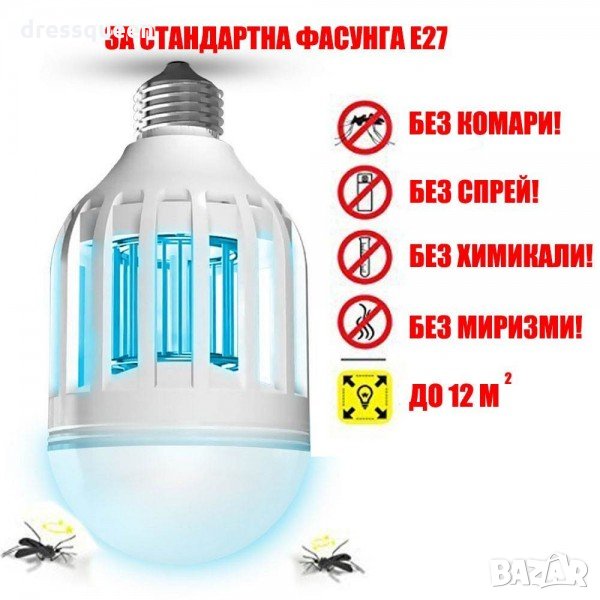 Понякога производителите измислят такива неща, че човек се чуди как до сега не са го измислили. Тази лампа принадлежи имено към тази категория продукти. Помислете само, какво по-логично от това: вместо обикновена крушка за осветяване, да навием в полюлея или нощната лампа една крушка, която ще унищожава насекомите в стаята! Край на чуденките къде да поставите лампата против комари от класически тип с кабел, а след като й намерите място да се чудите в кой контакт да я включите или да търсите разклонител, защото кабела не стига. Сега просто завивате в някоя фасунга и готово!