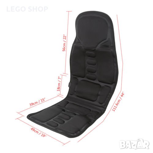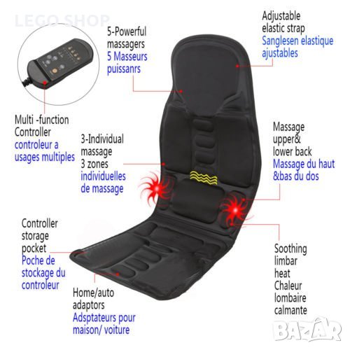 Просто закачете тази подгряваща масажна седалка на стола си и се насладете на едно удобно пътуване. Подарете си затоплящ и тонизиращ, масажен релакс, докато карате автомобила, буса, камиона... на дълги разстояния, стоите в градския трафик или на работното място,а може и докато си почивате у дома. Нежните вибрации ще улеснят напрегнатите му мускули, като ви позволяват да се чувствате спокойни, докато шофирате или работите. Новата функция за термотерапия ще помогне за успокояване на тялото ви! Удобното дистанционно управление ви позволява да избирате целевите зони, където се нуждаете от масаж, и да изберете скоростта на вибриране според вашите предпочитания. Има пет двигателя, които масажират врата, гърба, бедрата и бедрата. Контрол на скоростта.