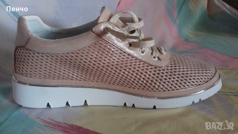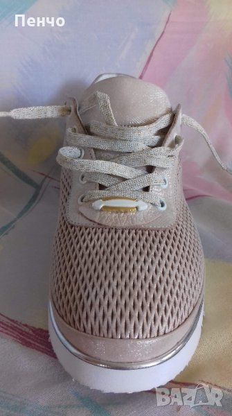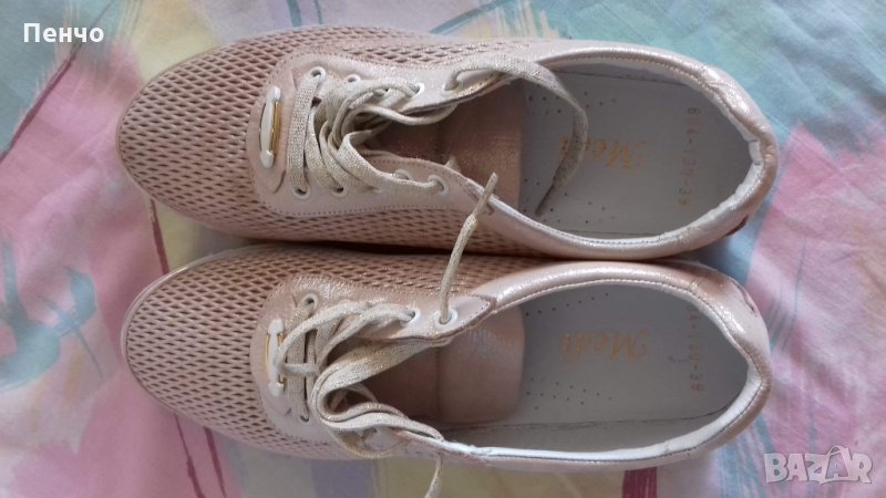 Дамски спортни обувки от естествена кожа в златисто- розов цвят. Размерът отговаря на 38 номер. Цена-50 лв. Летни- с перфорации по кожата.