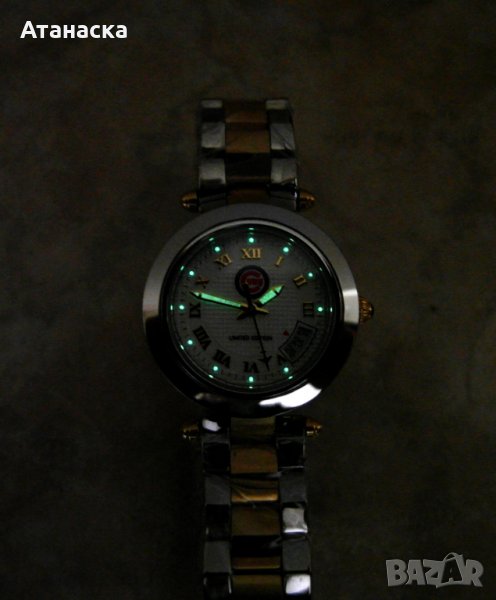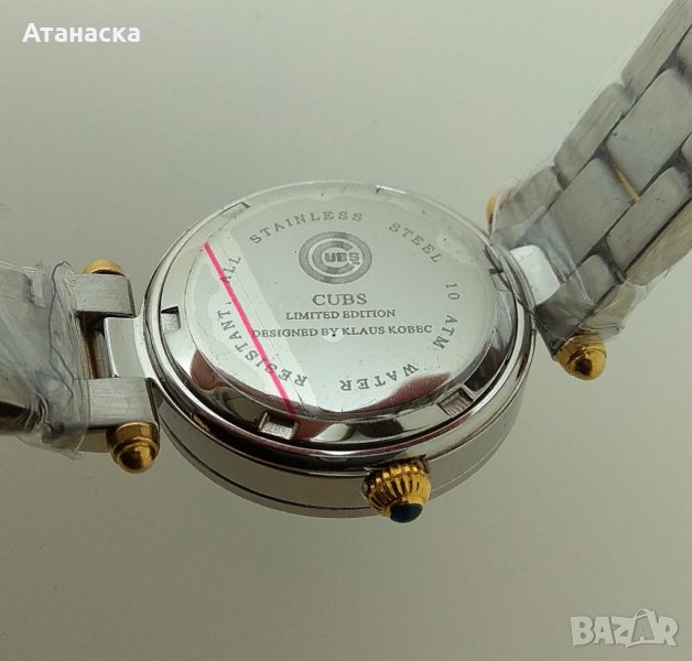 Супер промоция , няма такава цена дори в Западна Европа и Америка ! Цена нов в Англия 515 паунда ! Часовника е на дизайнерската компания Klaus-Kobec , лимитирана серия с емблемата на бейзболният отбор Chicago Cubs . Чисто нов красив английски дизайнерски часовник с качествен швейцарски кварцов механизъм Ronda , неръждаема стомана в 2 цвята (златист и сребрист), коронката е със син сапфир , бял циферблат с римски цифри в златист цвят , стрелки в златист цвят , светещи стрелки и индекси , кристално стъкло , дата на 4 часа , воден 10 атмосфери (100м), диаметър 28мм без коронката . С чисто нова батерия . Комплект с луксозна дървена кутия в бял гланц и книжка . Внос от Англия . От същата серия имаме налични часовници с емблемите на бейзболните отбори Houston Astros, San Francisco Giants, Pittsburgh Pirates. Повече информация на лично съобщение . Внимание - в сайта снимките се качват с понижено качество , който иска мога да му пратя такива с по-добро качество !