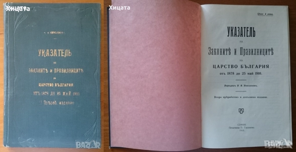 Указатель на законите и правилниците на царство България отъ 1878 до 25 май 1910 г. Наредителъ Н. А. Николаевъ,Печатница.П. Глушковъ,1910г.268стр. Изключително състояние! - 130лв Сборникъ на действуващите съдебни закони въ царството (1878-1936).Часть 1,Държавно книгоиздателство,1936г.1396стр.+разгъваемо приложение! - 150лв История на България Том 1-7, БАН, Много запазени,3том е без обложка. - 1000лв.Продават се и отделни томове! История на България от Блазиус Клайнер, съставена в 1761 г.Блазиус Клайнер,БАН,1977г.205стр. - 50лв. Нова Голяма