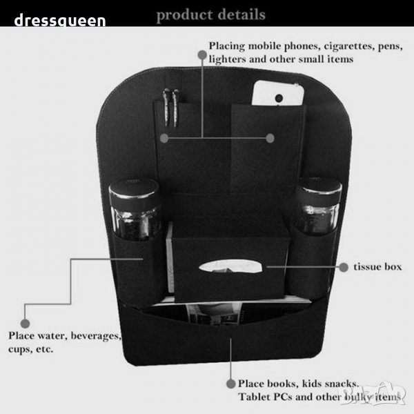 Органайзерът за кола се поставя на гърба на предната седалка - универсален и за двете седалки. Разполага с различни отделения - джобове, които намират място за всяка една вещ във Вашата кола.