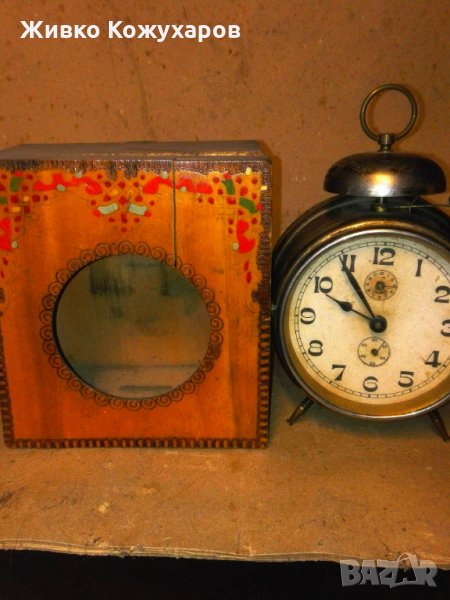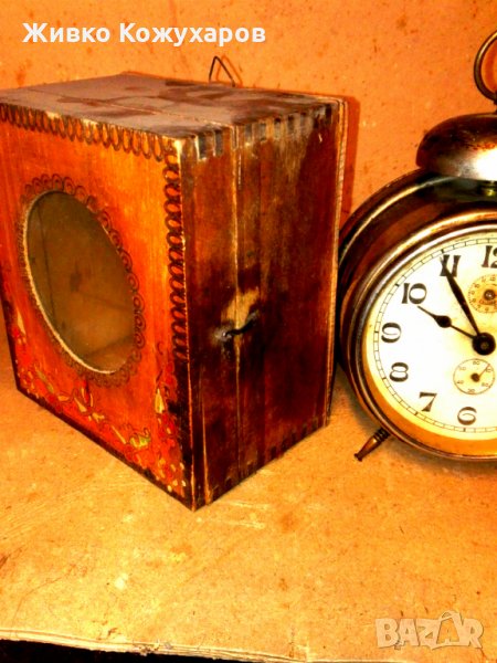 Показани са няколко дървени кутии за часовници-будилници: Изрисувани,перографирани,резбовани. Те са от началото на миналия век,а часовникът до тях е за само за онагледяване. Цените са за 1 бр. Будилникът се е слагал в кутията и от прозорецът се е виждал циферблата му. Кутията го е пазела от прах,а и е имал по-добър резонанс,когато звъни! Има кутии за малки и големи будилници!