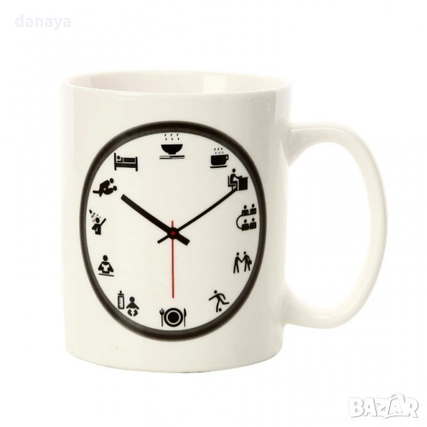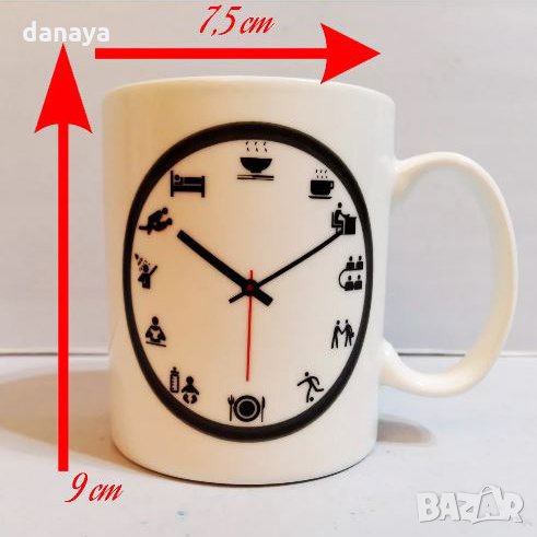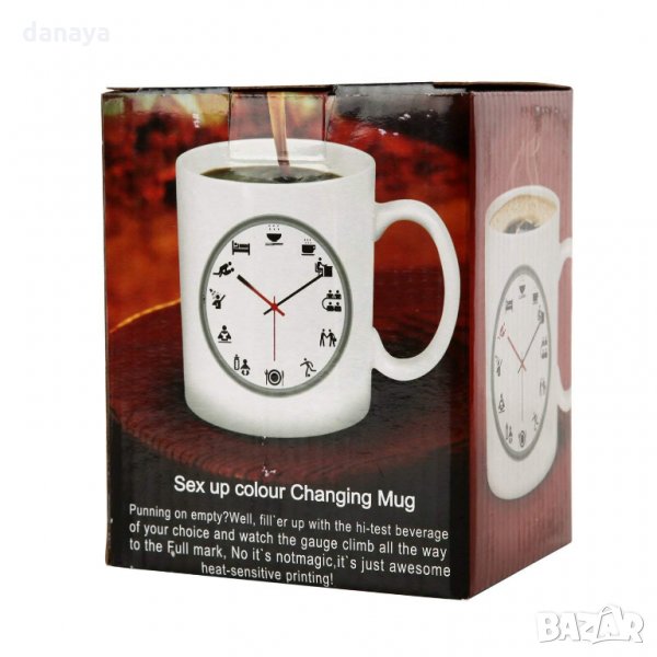 чаша с надпис забавен часовник, върху който е изобразен график за деня. Когато в чашата се налее гореща напитка, една от картинките се оцветява в червено, където е и закачката в тази красива чаша. Изненадайте някого или се забавлявайте като напълните чашата с топло кафе или чай и открийте скритата закачка в магическата картинка. Оригинален подарък за нея. Красива и стилна порцеланова чаша със забавно изображение.