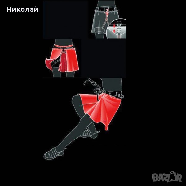 носят бримките на колана. Част от полата покрива къси панталони, създавайки нов