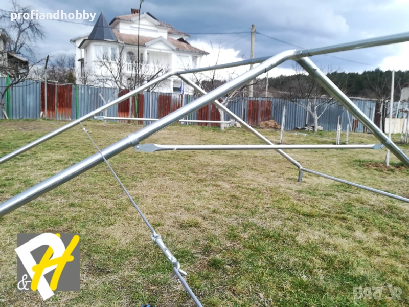 Този модел предлага много висока издръжливост, благодарение на допълнителните укрепващи елементи на покрива и в основата, както и допълнителните ъглови тръби - увеличават стабилността на конструкцията и предпазват брезента при умерен снеговалеж.