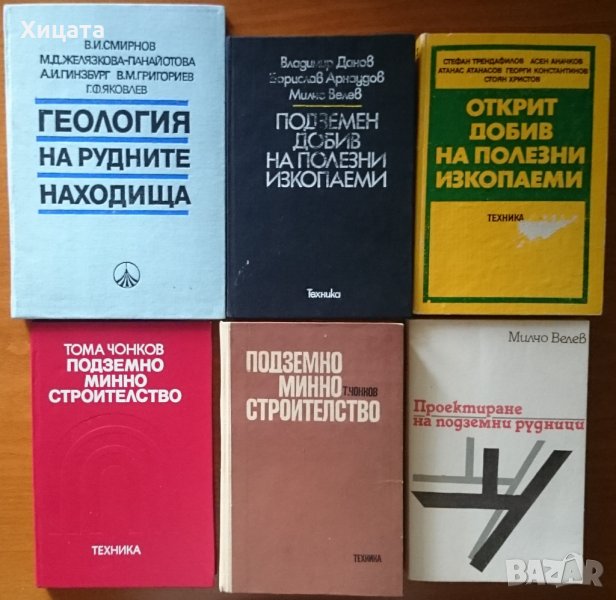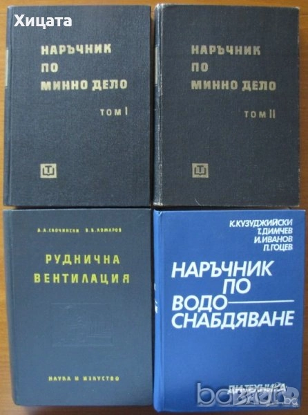 Подземно минно строителство,Тома Чонков,Техника,1975г.652стр.Много запазена!- 50лв.Наръчник по водоснабдяване К. Кузуджийски, Т. Димчев, И. Иванов, П. Гоцев,Техника,1971г.798стр. - 100лв.Подземен добив на полезни изкопаеми,Владимир Данов,Борислав Арнаудов,Милчо Велев,Техника,1985г.436стр. - 40лв. Открит добив на полезни изкопаеми,А.Аначков,С.Трендафилов,С.Христов,Техника,1987г.400стр. - 40лв.