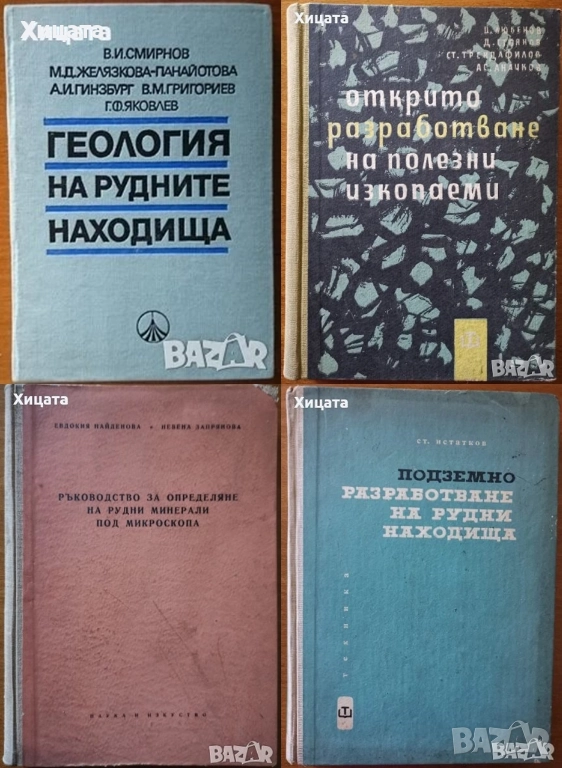 Подземно разработване на рудни находища,Станко Истатков,Техника,1964г.446стр.Изключително запазена! - 50лв.Геология на рудните находища,В.И.Смирнов,М.Д.Желязкова-Панайотова,А.И.Гинзбург,В.М.Григориев,Г.Ф.Яковлев,Наука и изкуство,1986г.356стр.Отлична!,В.И.Смирнов,М.Д.Желязкова-Панайотова,А.И.Гинзбург,В.М.Григориев,Г.Ф.Яковлев,Наука и изкуство,1986г.356стр.Отлична! - 70лв. Открито разработване на полезни изкопаеми.Записки,Паун Любенов,Димимитър Стоянов,Стефан Трендафилов,Техника,1963г.538стр.Изключително запазена! - 50лв Неметални полезни изкопаеми в България,Том 1-2.Том 1:Екзогенни промишлени минерали и скали;Стоян Ст.Трашлиев,Техника,1988г.270стр. Том 2:Ендогенни промишлени минерали и скали;Стоян Ст.Трашлиев,1989г.260стр.900бр.тираж! - 140лв