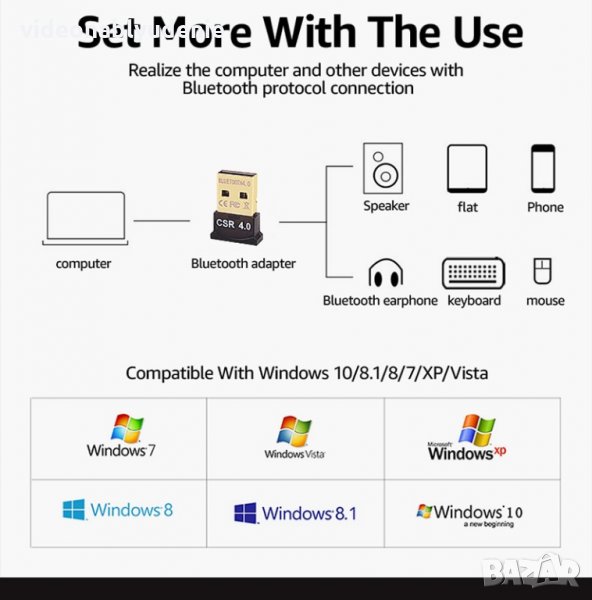 Устройството може да свърже вашият компютър/лаптоп с вашият смартфон, безжични колонки, мишка, клавиатура, таблет, слушалки, изобщо всякакви устройства ползващи Bluetooth свързаност!