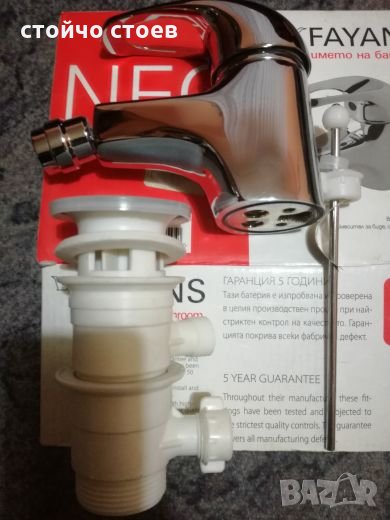 Смесителната батерия става и за биде. Със сифон за мивка и меки връзки.