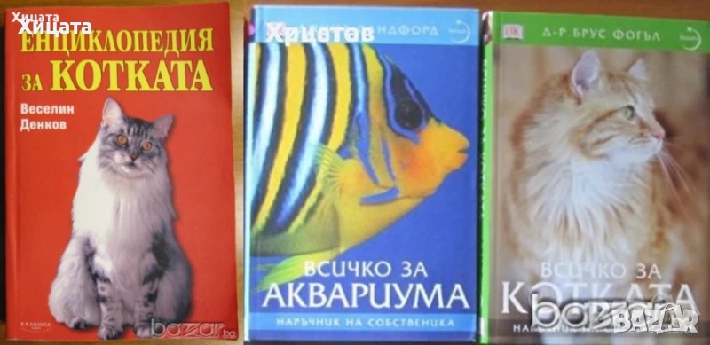 Всичко за аквариума - Наръчник на собственика,Джина Сандфорд,Зенит,2004г.256стр. - 110лв. Всичко за котката: Наръчник на собственика, Д-р Брус Фогъл, издателство Зенит,288стр.- 110лв. Отлични! Енциклопедия за котката,Веселин Денков,Изд.Калиопа,1999г.431стр. 74 цветни и 163 черно бели илюстрации! Отлична! - 80лв.