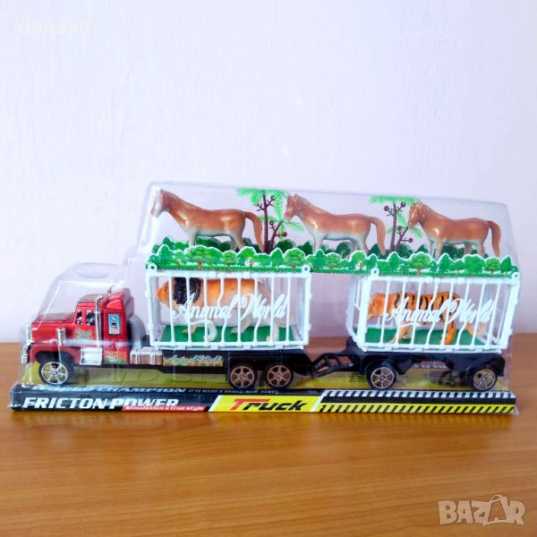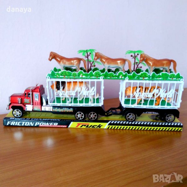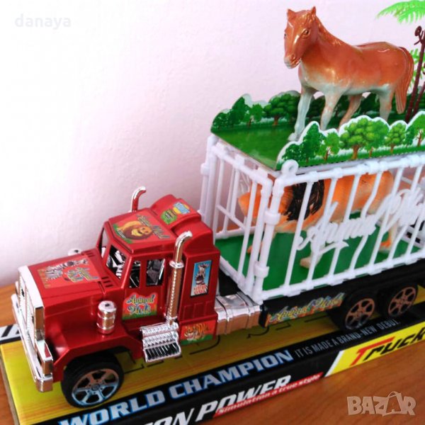 Голяма детски камион с червена кабина. Камионът идва с две клетки. В едната клетка има лъв, а в другата тигър. Над клетките са разположени 3 коня. Интересна и занимателна играчка за момчета и момичета. Чудесен коледен подарък.