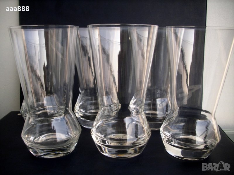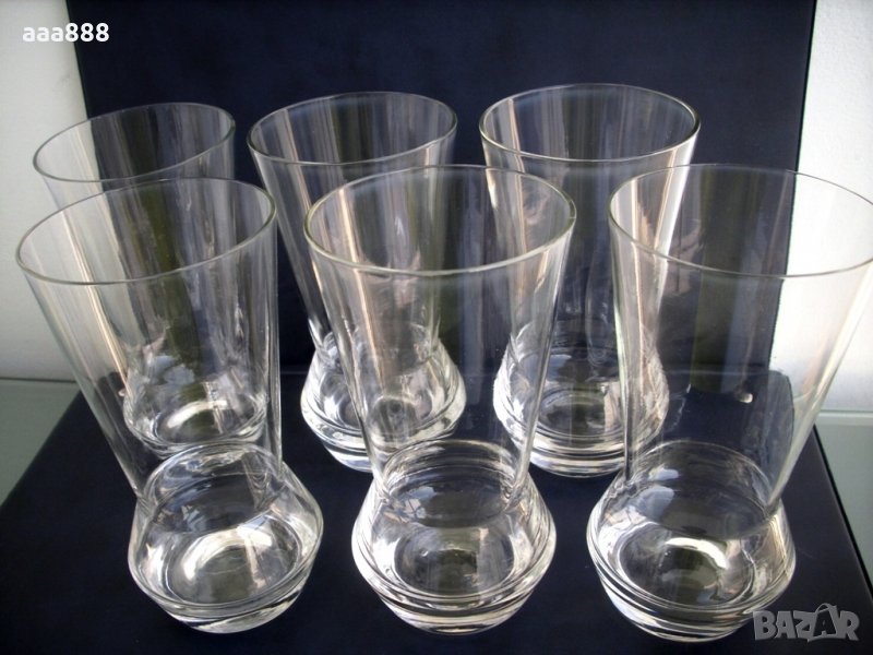 Комплект 6 броя чаши от фино калиево стъкло за вода, безалкохолно, узо, коктейли и др. Българско соц.производство. Чашите са тънкостенни, стабилни, с гладък заоблен кант и масивно дъно с дебелина 1 см. Височина 13 см, диаметър горе 7 см, долу 5 см. Сервизът е неупотребяван, безупречен.