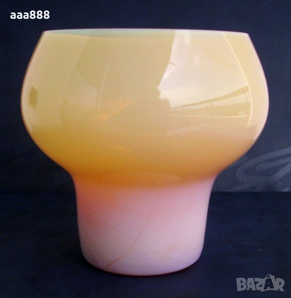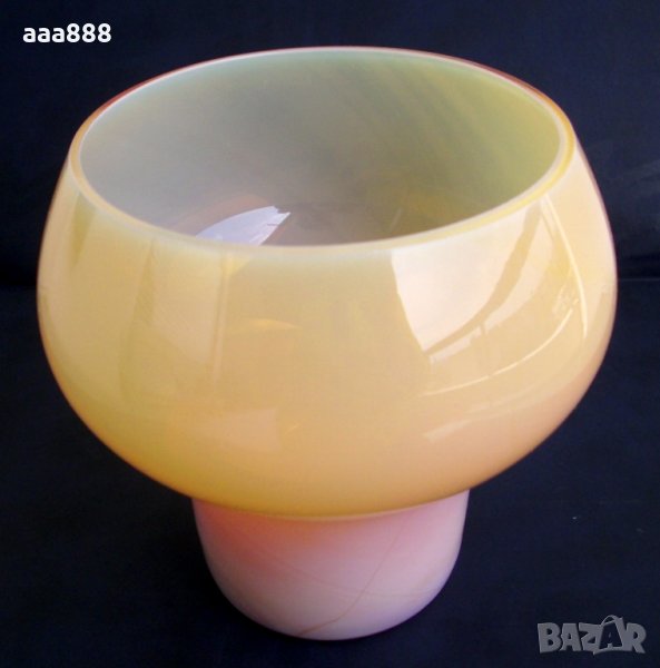 Атрактивна купа от дебелостенно цветно стъкло в преливащи се нюанси. Столчето е масивно, тежко и плътно. Българско соц.производство. Неупотребявана, нова, с безупречен вид.