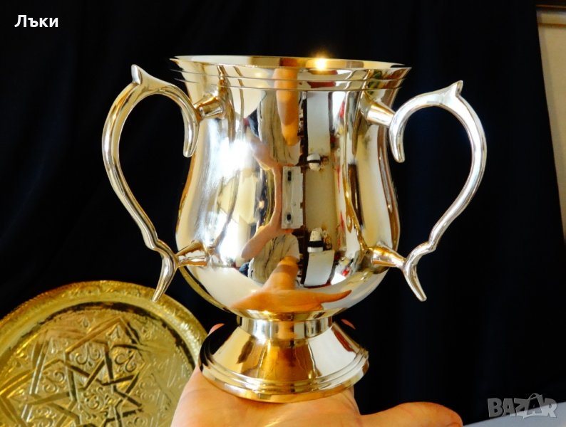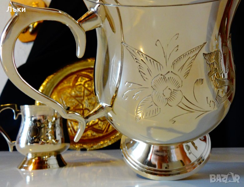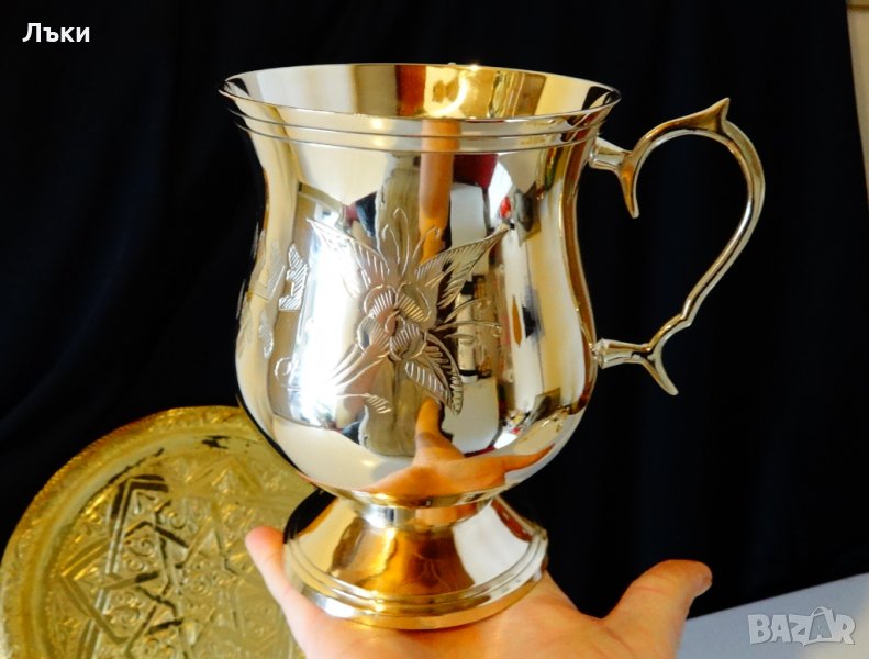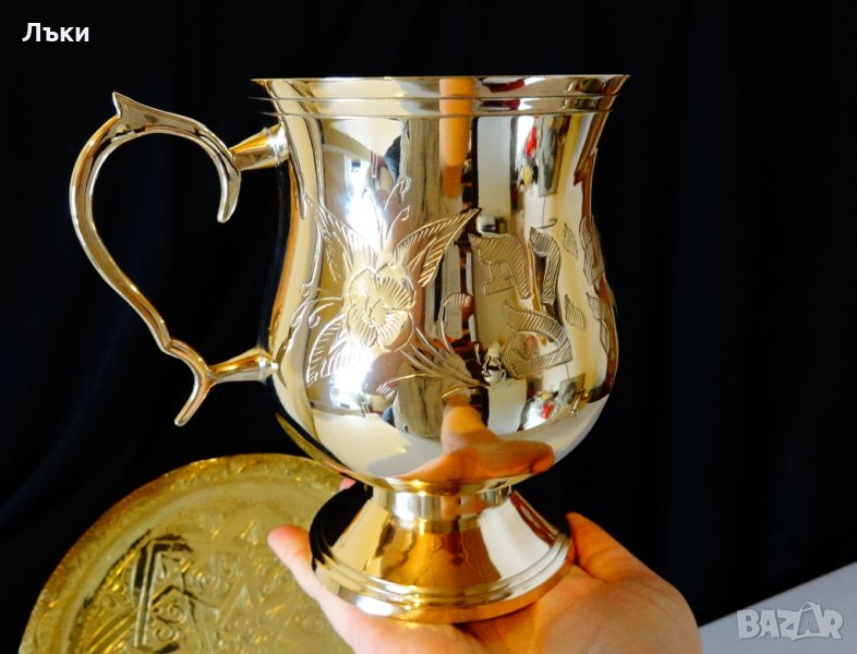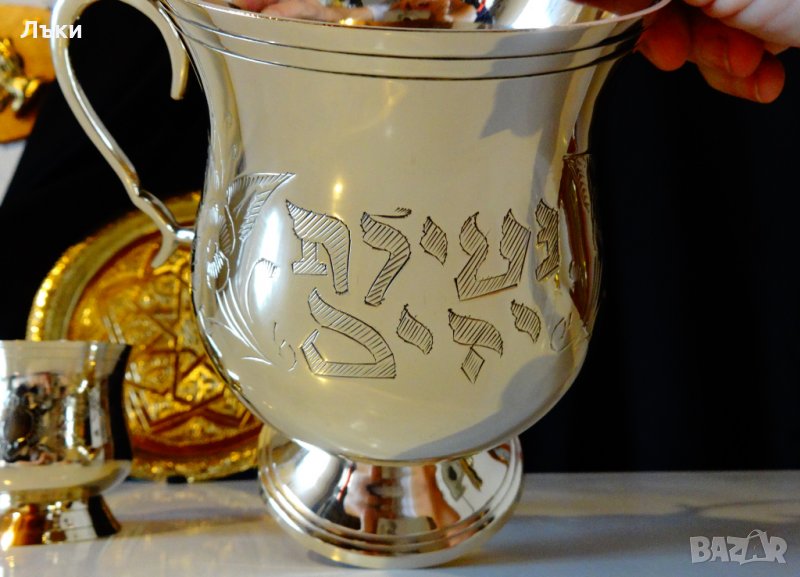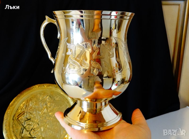 Уникален старинен бокал,чаша,майсторска ръчна изработка от масивен високо качествен бронз.Бокала има две дръжки за да могат двамата съпрузи,семейната двойка да държат заедно чашата,от която пият.Между дръжките бокала е красиво декориран с релефно гравирани цветя и послание на иврит,чието значение е тайна за мен.Височина 16 см.,диаметър 12 см.,тегло 570 гр.Вместимост 1 литър.