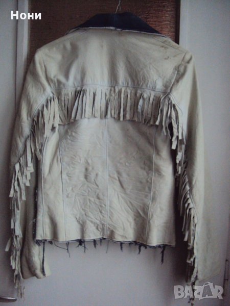 Марково яке от естествена кожа комбинирано с дънков плат. Купено от Италия. На ръкава има ресни, които продължават и на гърба. Дължина на ръкава 61 см. Гръдна 82 см. Цяла дължина на гърба 53 см.Състояние Ново, обличано до пъти. Отвътре е с бяла подплата.