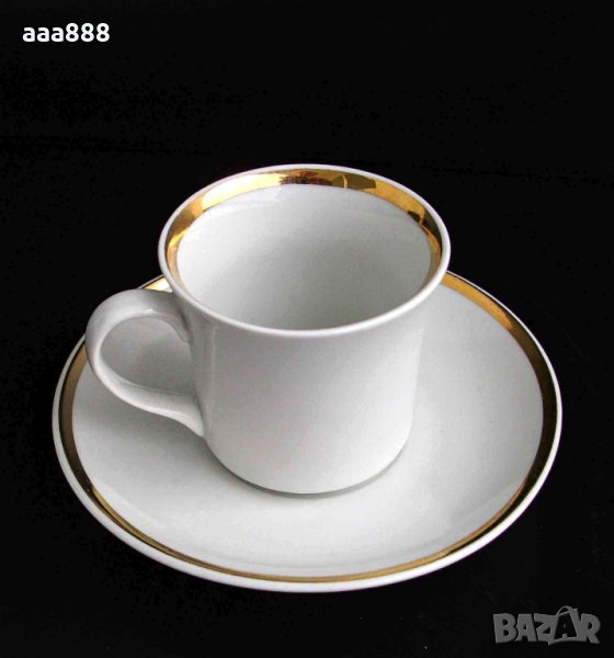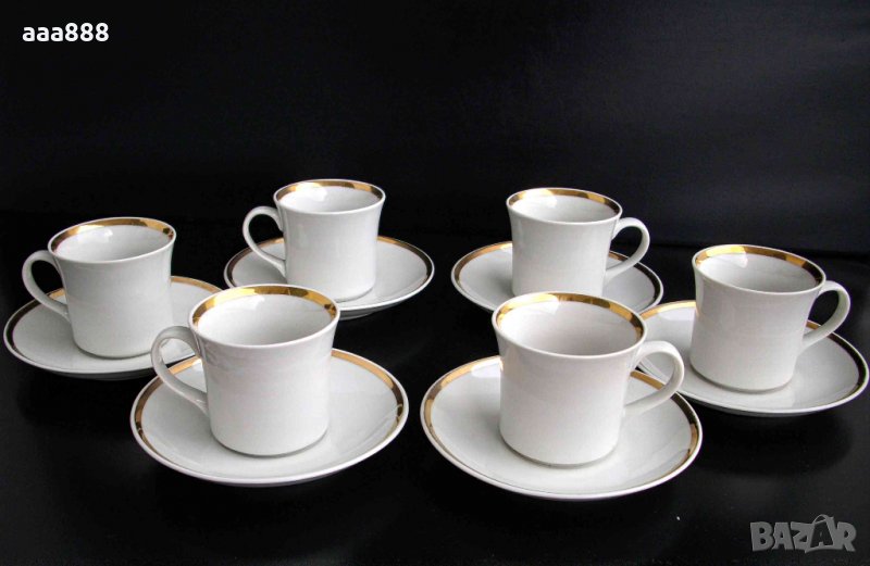 Сервиз за кафе от първокласен бял порцелан с широка златна линия на Thun ТК, Карлови вари, Бохемия. Модел Athos, 12 части, производство Чехословакия. Нов, неупотребяван. Всяка част е фабрично маркирана.