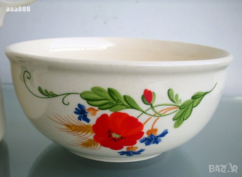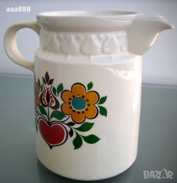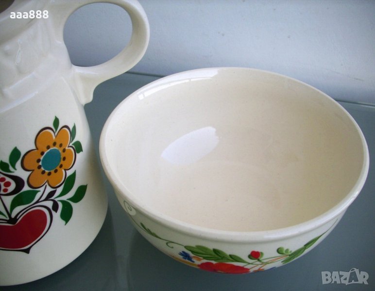 Атрактивни кана и купа от керамика Heike с флорална декорация, изцяло покрити с глазура. Соц.производство на VEB Steingutwerke Torgau, ГДР, Източна Германия. Съдовете са в ново състояние, никога не са употребявани. Каната е двустранно декорирана, а на купата има три декорации. Фабрично маркирани с лого и надпис. Размери: кана - височина 17 см, диаметър дъно 12 см, вместимост 1,300 л; купа - височина 7,5 см, диаметър горе 16,5 см.