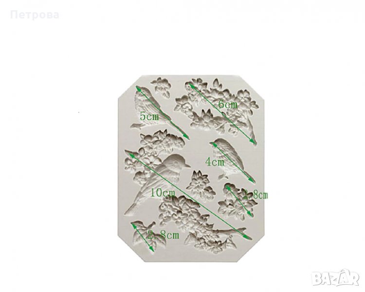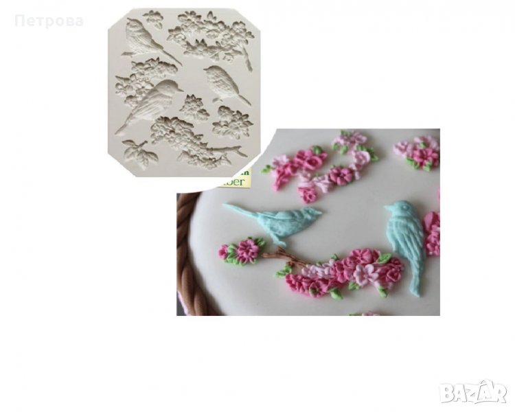 Това е силиконов молд, предназначен за работа с фондан, шоколад и др. Служи за изработване на изящни орнаменти – птици на цъфнало клонче за декорация на торти, пасти, мъфини или просто сладкарски фигурки.