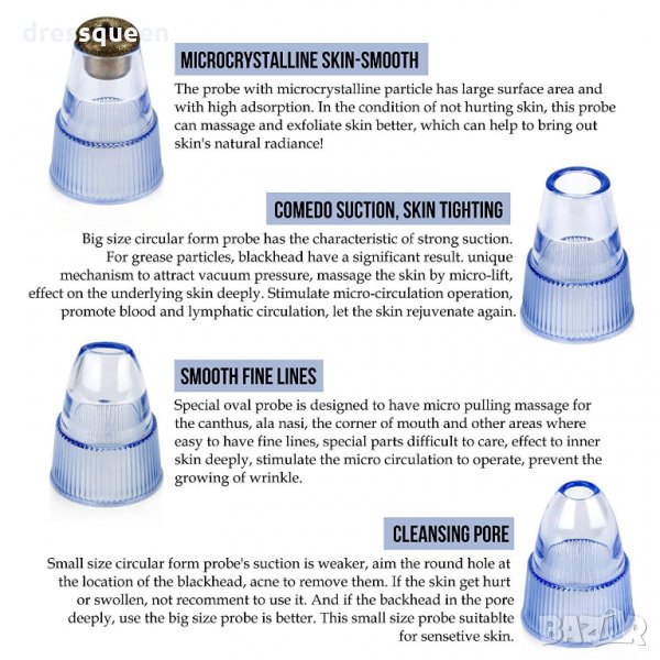 Вакумен уред за ексфолиране на мъртва кожа, премахване на черни точки, комедони, омазняване и др. Засилва кръвообръщението на кожата, подобрява еластичността и премахва малките бръчици. Уреда има LCD дисплей, акумулаторна батерия и 5 степени на работа.