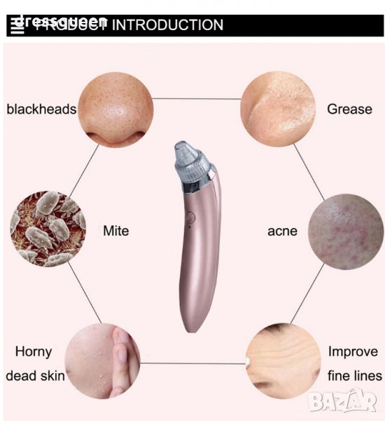 Уреда има функции на изглаждане и овлажняване на кожата, отстраняване на акне, почистване на порите и изсмукване на комедони. Той е акумулаторен, лесен и удобен за употреба. Предлага се с 4 накрайника, които предлагат различни функции за по-дълбоко почистване кожата на лицето ви. Помага да премахнете порите, черни точки, бръчки на лицето си и да поддържате кожата чиста.
