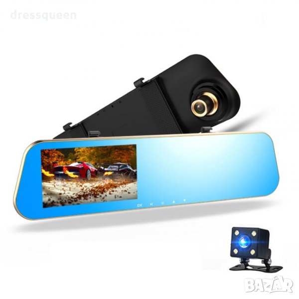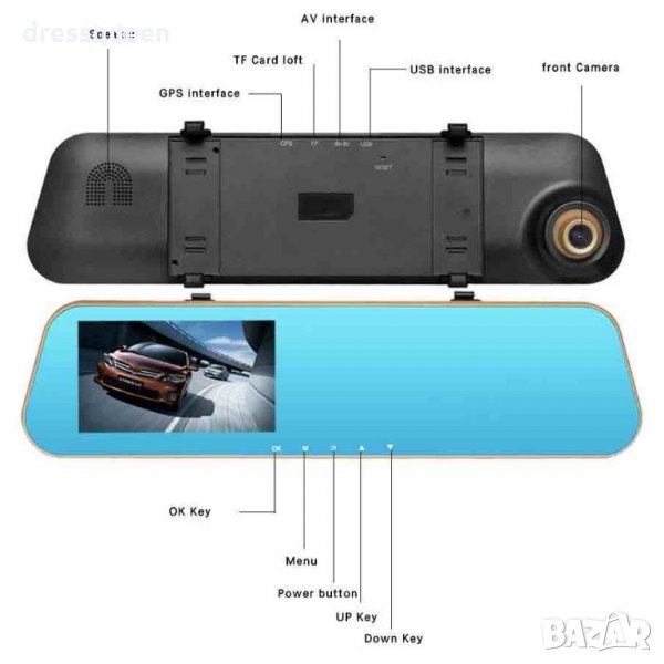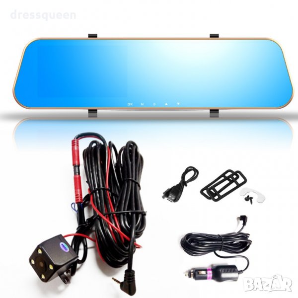 Дисплей: 4.3 LCD екранОгледало:Елегантен дизайн с златист кантВтора камера: ДаРезолюция: 500P Full HD камераВидео резолюция: максимум 1080 PФормат на файлове: AVIФормат на снимки:JPEGФормат на видео: M-JPEGШирок ъгъл на зрително поле: 170 ͦНощен режим: ДаВграден микрофон: ДаВграден G сензор: ДаКарта памет: Поддържа до 32GB SD карта (закупува се отделно)Захранване:Вградена батерия от 300 mA
