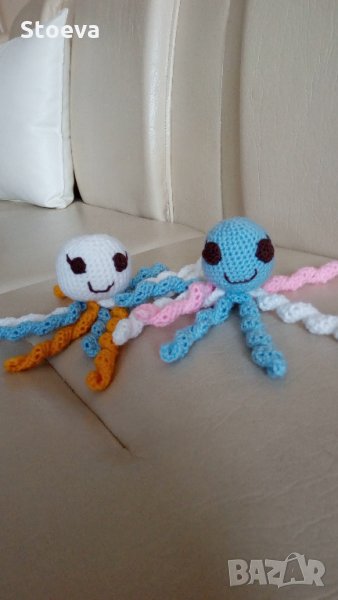 Октоподчетата са изплетени от бебешка прежда - 100% акрил , телцата са пълни със силиконов пух . Дължина : 17 см .Перат се с хладка вода и мек перилен препарат . Доставка с ЕКОНТ . Цената е за брой .
