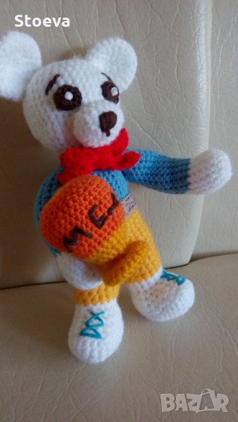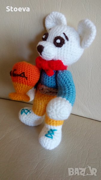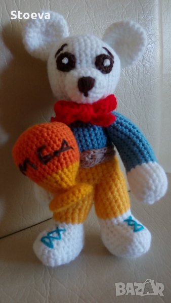 Малко мече с делвичка мед ,високо 20 см . Изплетено от бебешки прежди и пълно със силиконов пух . Може да се пере. Доставка с ЕКОНТ , наложен платеж .