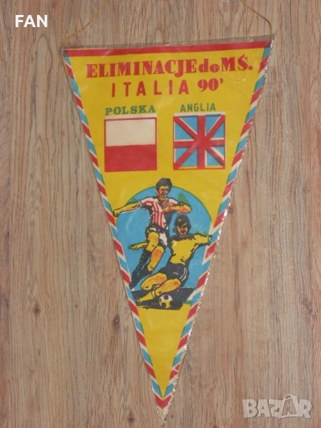 3) Флагче от мача Полша - Англия - Квалификация за световното първенство в Италия през 1990, игран на 11 октомври 1989 г. Флагчето е с размери 22 см х 40 см, изработено е от картон в найлонова обвивка. - 6 лв.