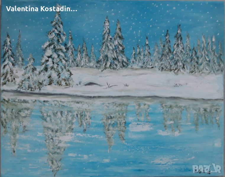 Маслена картина,, Зимен пейзаж- Отражения,, . Ръчно рисувана картина с маслени бои върху платно с подрамка. Художник Валентина Костадинова. Размер 40в/50ш. Подарък рамка. Безплатна доставка с наложен платеж.