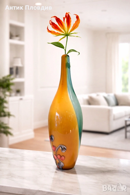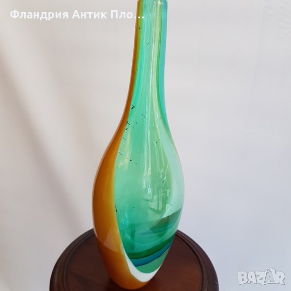 Оригинална ваза от арт стъкло, във форма на бутилка. Две различни страни, с различна цветова комбинация. Изпълнена в Мурано стил.