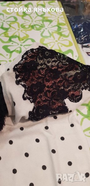 Продавам дамска бяла блуза с черни точки и дантела мека финно плетена → Обява 23722603