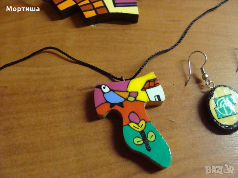 Испански дървени ръчно рисувани бижута Арт не са използвани .Гривна дължина 25 см елемент 5 на 3,5 см Колие дължина на връвта 80 см може да се регулира висулка 5 на 3,5 см .Обеци дължина с кукичките 4 см висулки 2 на 1,5 см кукички медицинска стомана ръчно рисувани на ушите седят с две различни лица ЦЕНАТА НЕ ПОДЛЕЖИ НА КОМЕНТАР НЕ ЖЕЛАЯ БАРТЕРИ ( ПРОДАВАТ СЕ САМО В КОМПЛЕКТ )