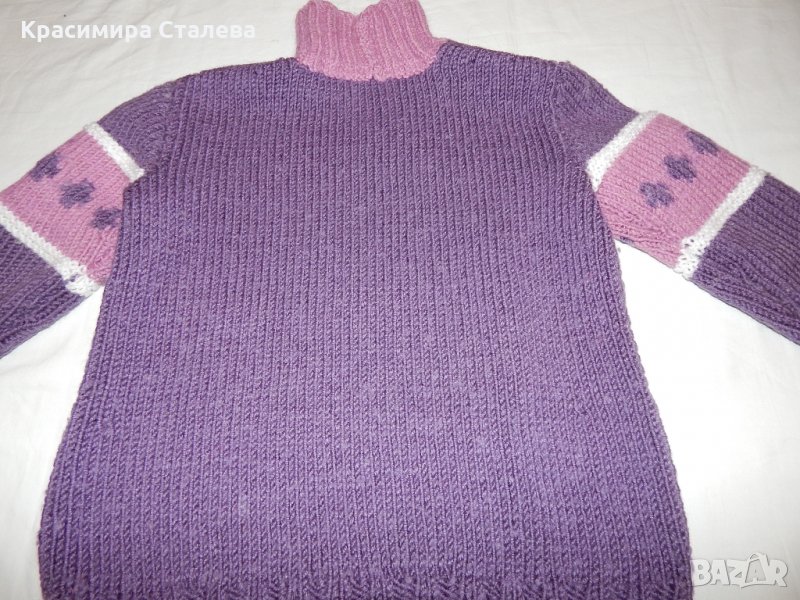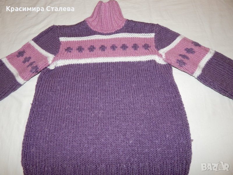 Полото е ръчно плетиво от мека прежда. Размери - рамене - 33 см., подмишници - 39 см., дължина - 49 см., дължина на ръкава от врата - 50 см.