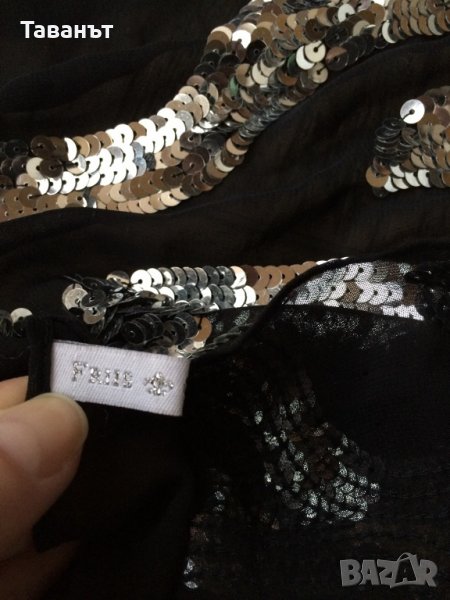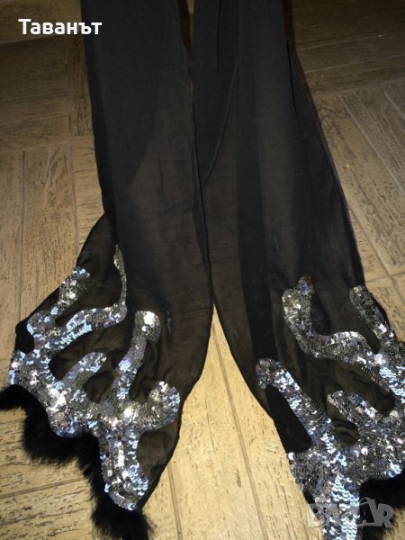Луксозен тюлен шал на италианската марка Friis Company, изключително ефектен и стилен, по краищата е с 100% заешка кожа и пайети, дължина 135 см, ширина 25 см