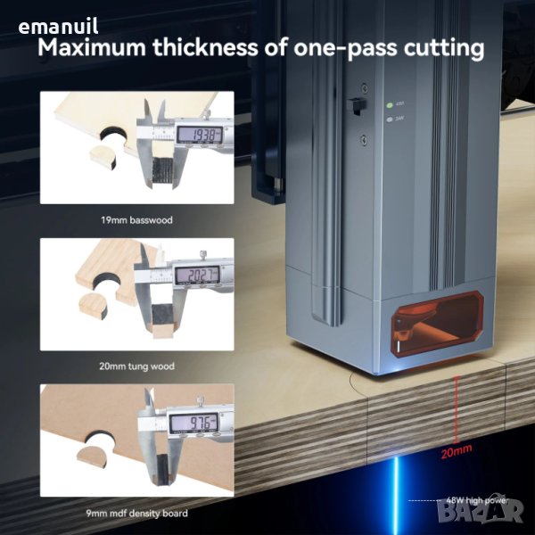 СИН-BLUE 450nm подходящ за рязане/гравиране всякаква дървесина,гравиране черна и неръждаема стомана,рязане/гравиране кожа,гравиране естествен-изкуствен камък и техни разновидности,рязане на всякакви пластмаси и гравиране предимно на двуцветни,гравиране на прозрачно стъкло с потъмняване или със специално цветно фолио за не метални повърхности и др.