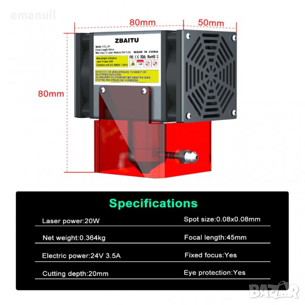 20W ZBAITU F20-VF 20W лазерен модул с Аir assist дюза с тръбен път,адаптерна планка-релса между машина и лазерния модул.