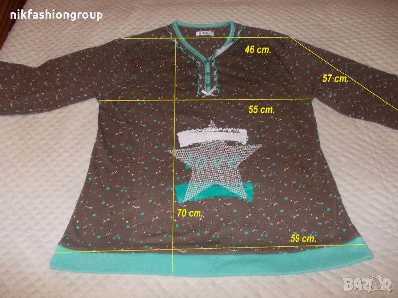 Материята е 100% памук. С вата от вътрешната част. Пижамата не се разстяга. Без етикет е, но няма никакви следи от употреба. В отлично състояние е. По етикет е размер L. Mарката е G & N. Размерите са показани на снимка. Размерът на ластикът е в разпънато състояние.