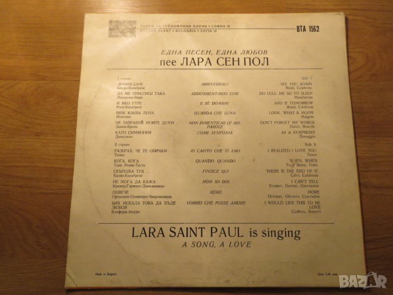 Грамофонна плоча Лара Сейнт ПОл БТА 1562 - стара италианска музика - изд. 70 те год !