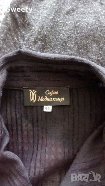 Черна блуза, с дълъг ръкав бели орнаменти, дължина 57 см, гръдна обиколка 96 см, талуя 82 см, дължина на ръкава от рамото 67 см, материал вискоза, произведено в Бг, бг размер 44