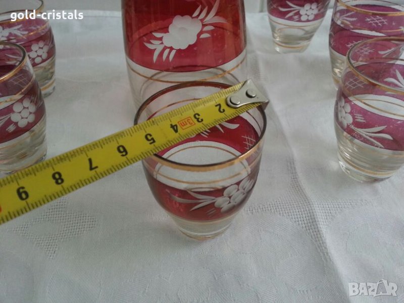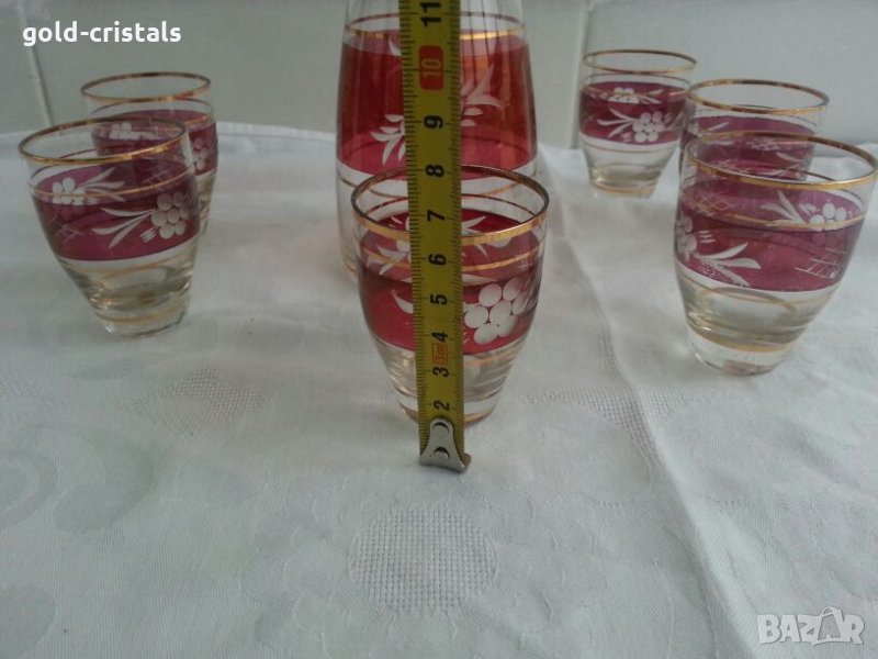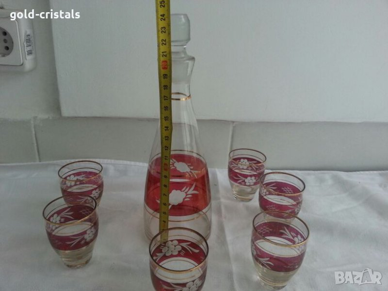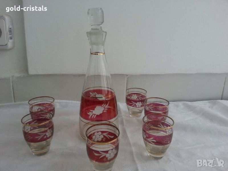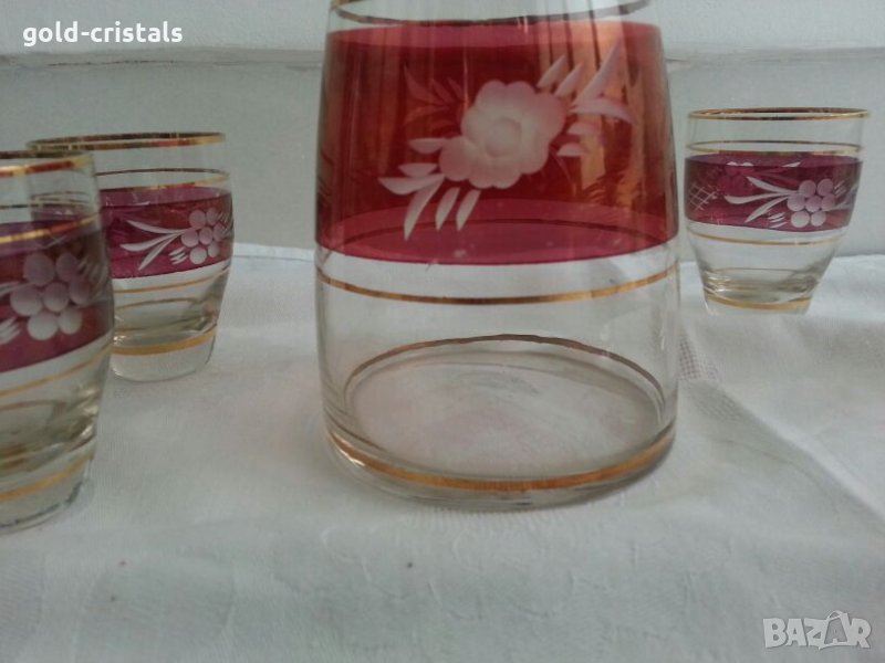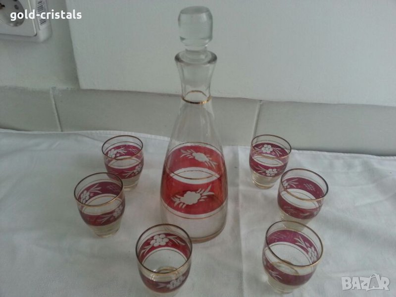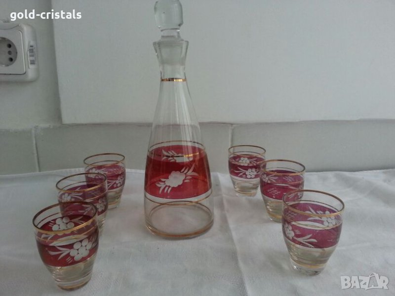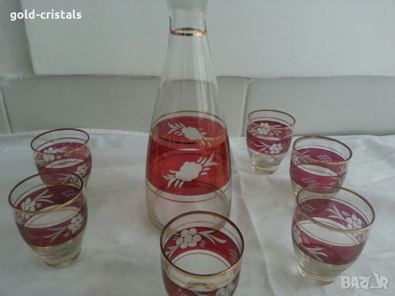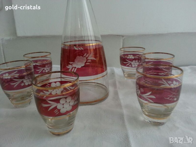Ретро стъклени чаши за ракия и гарафа и 6бр чашки гравирани цветно стъкло златен кант позлата бутилка шише стъклена тапа чаши сервиз комплект сет лот антикварен стар старинен арт винтидж колекция декор винтидж колекция стари старинни антикварни предмети обзавеждане за дома и семейството подходящи за подарък за ценители и колекционери