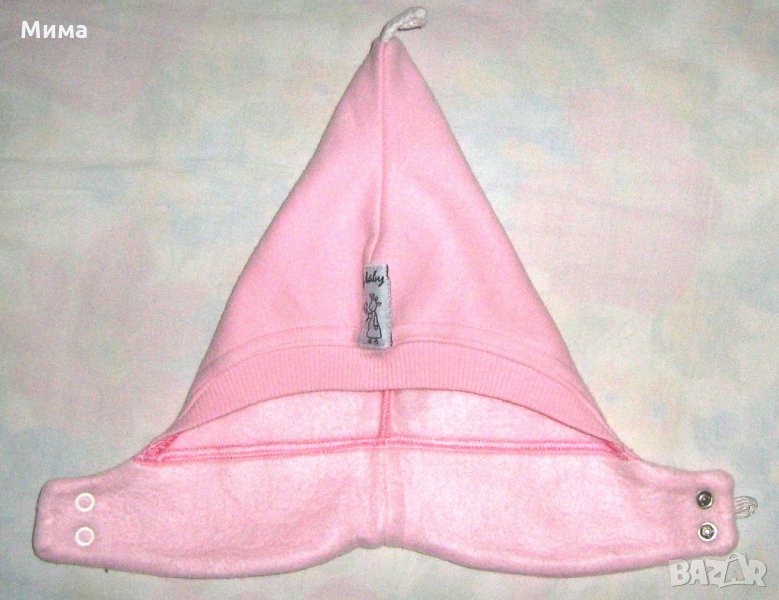 Шапка с връзки отдолу (розова) – 1 лвОбиколката на главата е 40 см. Розова шапка, с бяла и розова топка отгоре – 1 лв.Шапката е с обиколка 52 см, а отдолу под брадичката може да се връзва с връзки, така се