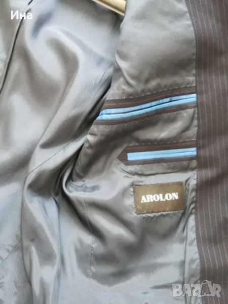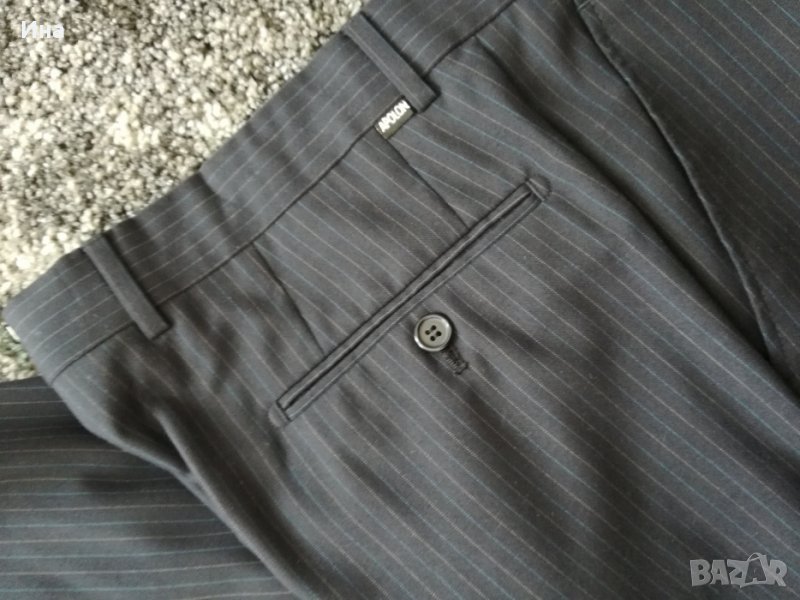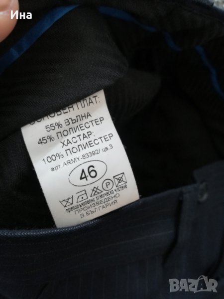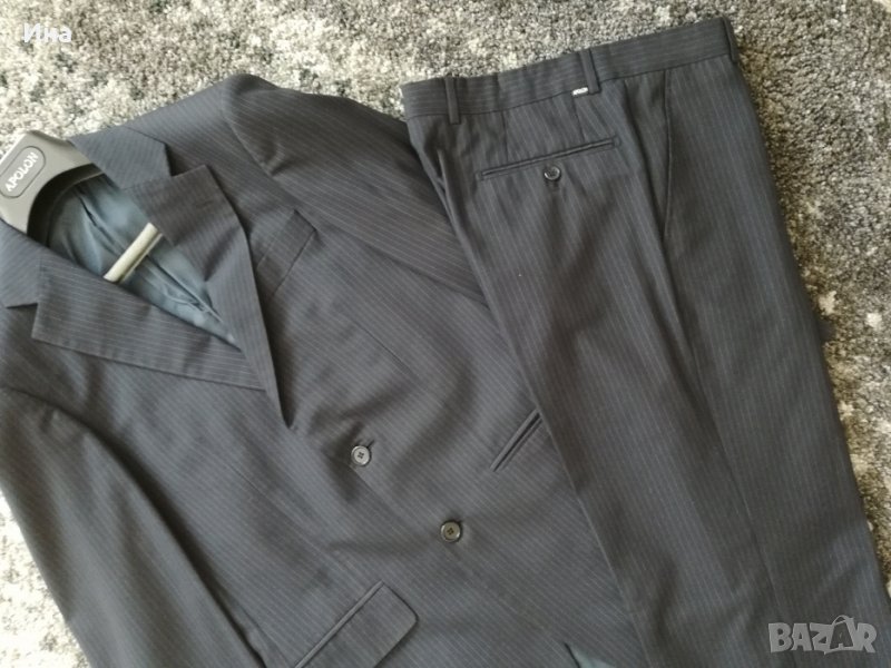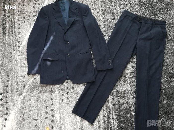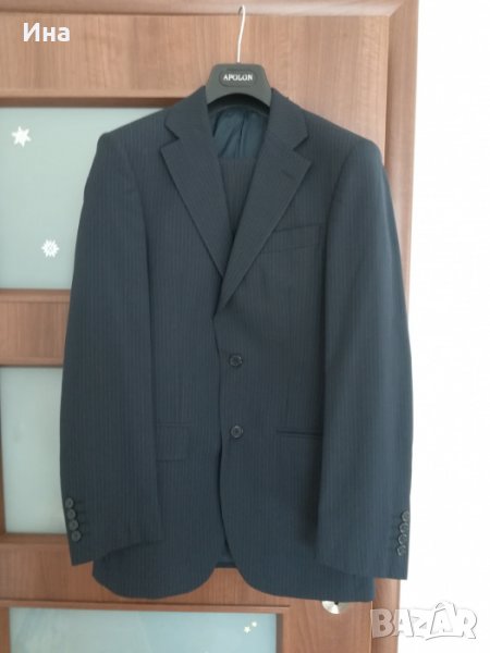Тъмно син костюм на райе Apolon. Костюмът е купуван за повод. Обличан веднъж и минал през химическо чистене. Размер 46. Състав - фина вълна и полиестер. Страхотен цвят и линия.