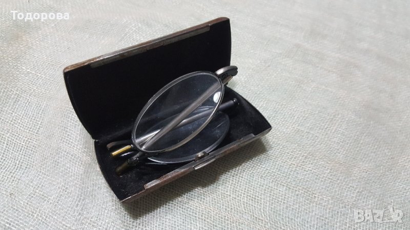 Оригинални старинни английски очила.С повреда в лявата телескопична дръжка. Датиращи от 1911 година,сгъваеми, в оригинален метален калъф.Размери кутийката-8х4х2 см.