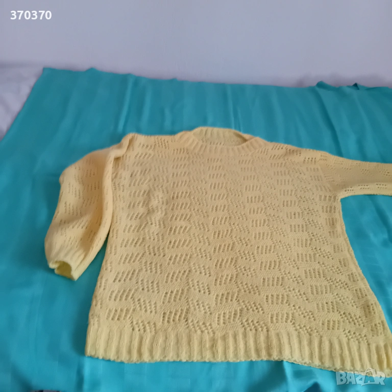 1. Блуза с листо - снимки 2 и 3 - паднал ръкав (т.е. без ръкавна извивка) от изкуствена прежда - тип вълнена. Плетка - лицева. Цвят - бледо жълта.