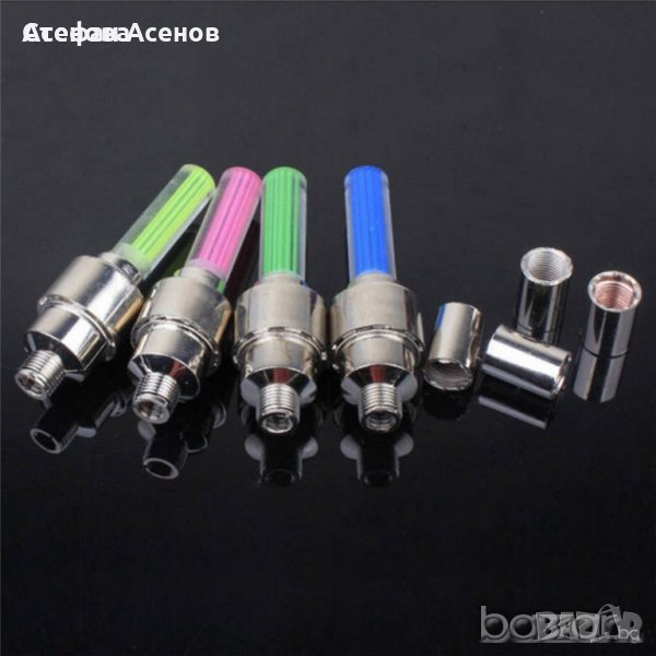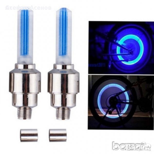 Светеща LED капачка за вентил на гума за велосипед, мотоциклет или автомобил в комплект с 3 броя батерии AG10. Цената за комплект от 2 броя капачки е 7 лв. Идеален подарък за деца и възрастни каращи велосипеди, мотори, автомобили, скутери, камиони и др.