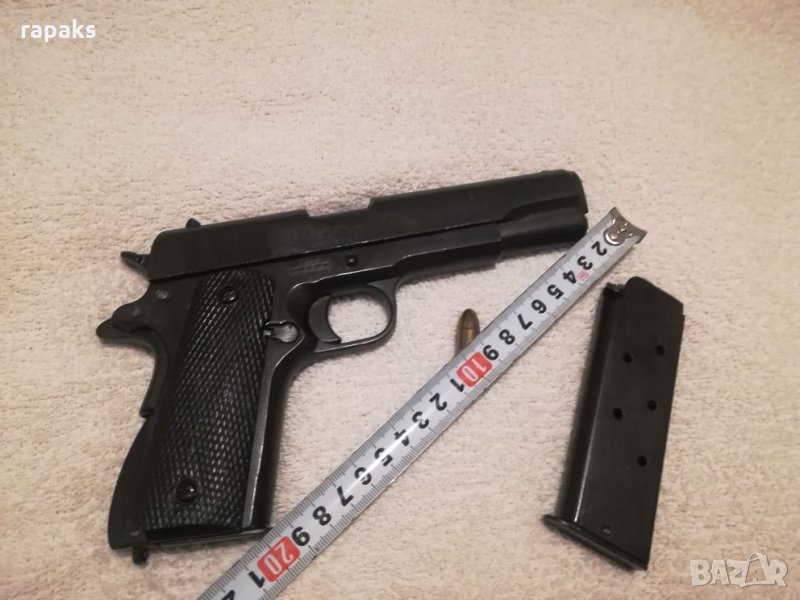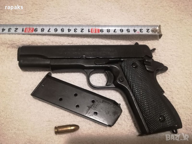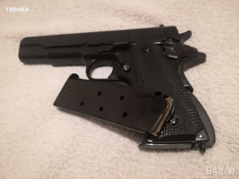 Пистолет внушителен със своите 1020 гр, без патроните, но и същевременно изключително ефективен модел-реплика на тази класика сред оръжията с пълнител. Дълго време на основно въоръжение в Американската армия и присъстващ във всяка оръжейна филмова класика от епохата. Имам го в над 7 варианта, но те си имат свои обяви, сега обект на продажбата е най-разпространеният в света модел на пистолет КОЛТ. Зарежда, щрака и частично се разглобява. Въпреки че може да се постави в пълнителя имитиращ патрон, той не може да стреля, както и да се преправи в действащ умиротворител! Понеже е НЕ стреляща реплика и за това е на свободна продажба и изпращам с Еконт до всяка точка в България. Важно е само да имате разрешението на тъща, комшии и най вече това на съпругата и имате ли парите и желанието ще притежавате едно специално