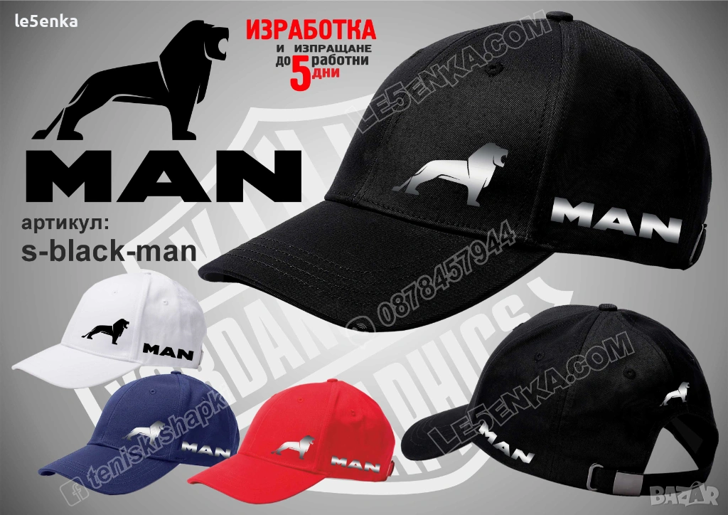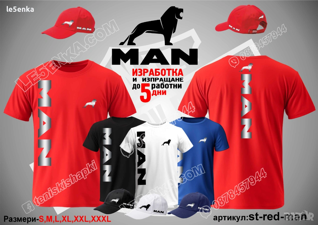 Посочената цена е за шапка и тениска комплект. Само шапка - 18 лв. ,а само тениска - 32 лв. Тениските са изработени от качествена памучна материя - различна номерация и цветове - черен, син, червен и бял. Шапките са памучни с метален клипс или коланче за регулиране - тип бейсболни. Последната снимка в обявата е на таблица с размери за тениските. Изпращаме по Еконт.