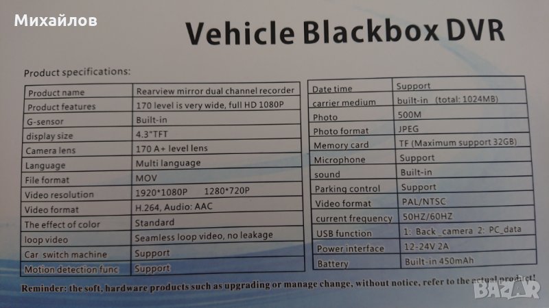 предна камера резолюция: HD 1920*1080P, 1280*720P - обхват: 170 градуса