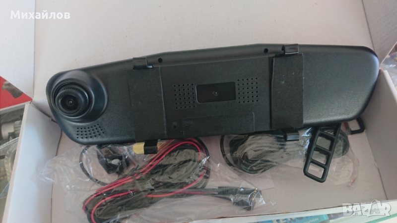 Едната камера е вградена в огледало и снима отпред, а другата е външна и се монтира отзад на автомобила и спомага при паркиране и маневриране назад.